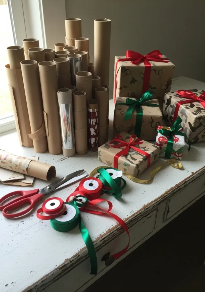 This cozy little corner perfectly captures the charm of homemade Christmas magic. A mix of brown kraft paper rolls, shiny metallic wrap, and colorful ribbons creates a lovely balance of rustic and festive. The presents, tied neatly with red and green satin bows, look straight out of a nostalgic holiday movie. Everything rests on a slightly weathered white table that adds character and warmth to the whole setup. It’s proof that you don’t need fancy wrapping paper or over-the-top decor to make your gifts look absolutely beautiful.