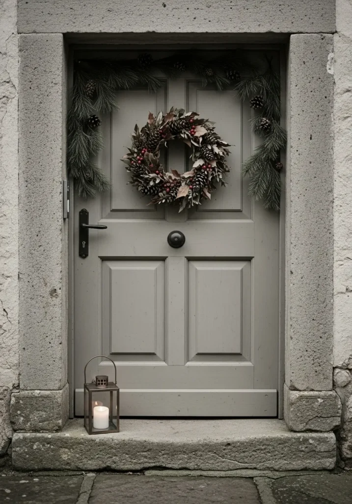 This design proves that understated elegance can make the warmest welcome. The soft gray door is framed with a natural pine garland sprinkled with pinecones, while a rustic wreath of dried leaves and berries adds a lovely pop of festive color. A single lantern with a white candle sits by the step, glowing softly against the stone—proof that a few well-chosen details can transform even the simplest entrance into something magical.