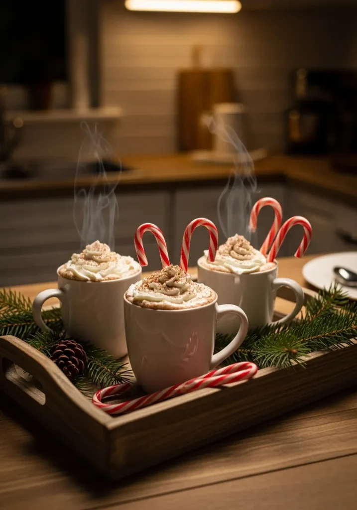 I love how this look proves that holiday magic can come from the smallest touches. The candy canes are so nostalgic, and the combination of creamy whites, warm wood, and soft steam feels cozy and real. If I saw this waiting on the counter, I’d probably smile before even taking a sip. It’s the perfect reminder that you don’t need a huge budget to create a scene that feels straight out of a Christmas morning memory.