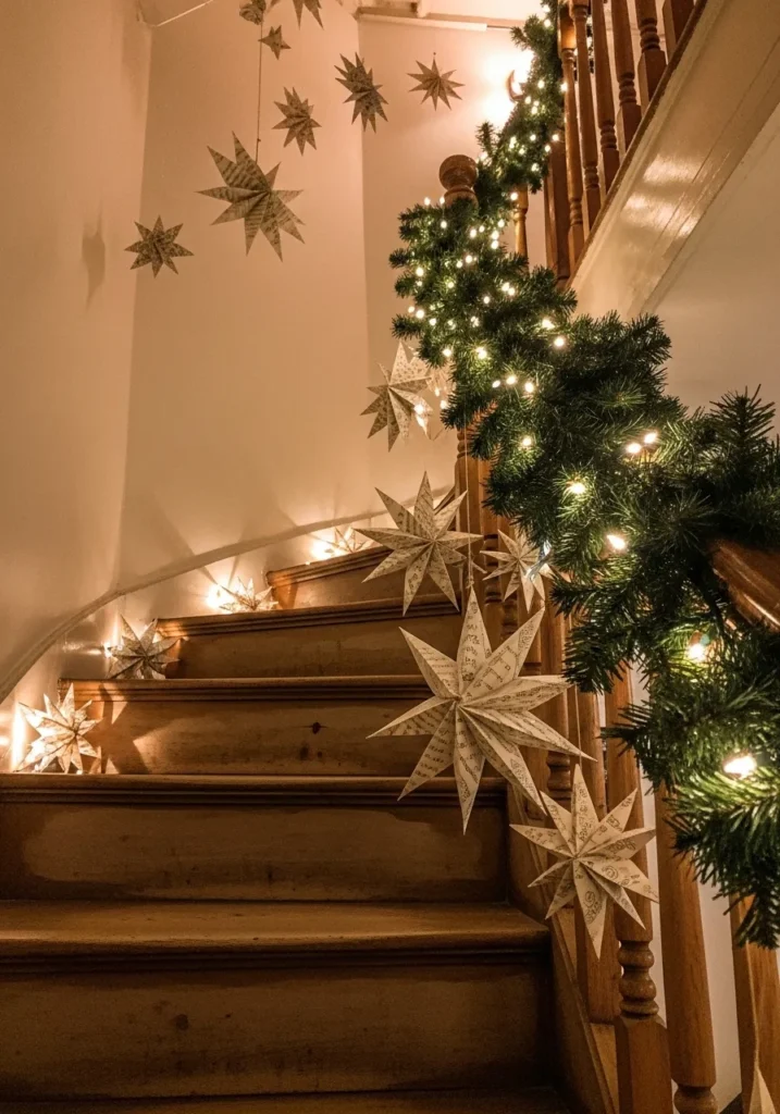 This staircase setup feels like something straight out of a cozy Christmas movie. The wooden steps are lined with glowing fairy lights and paper stars that look like they were crafted from vintage sheet music. A lush green garland winds up the railing, wrapped with tiny warm lights that give off the softest golden glow. It’s simple, handmade, and wonderfully charming—proof that you don’t need fancy decor to make your home sparkle for the holidays.