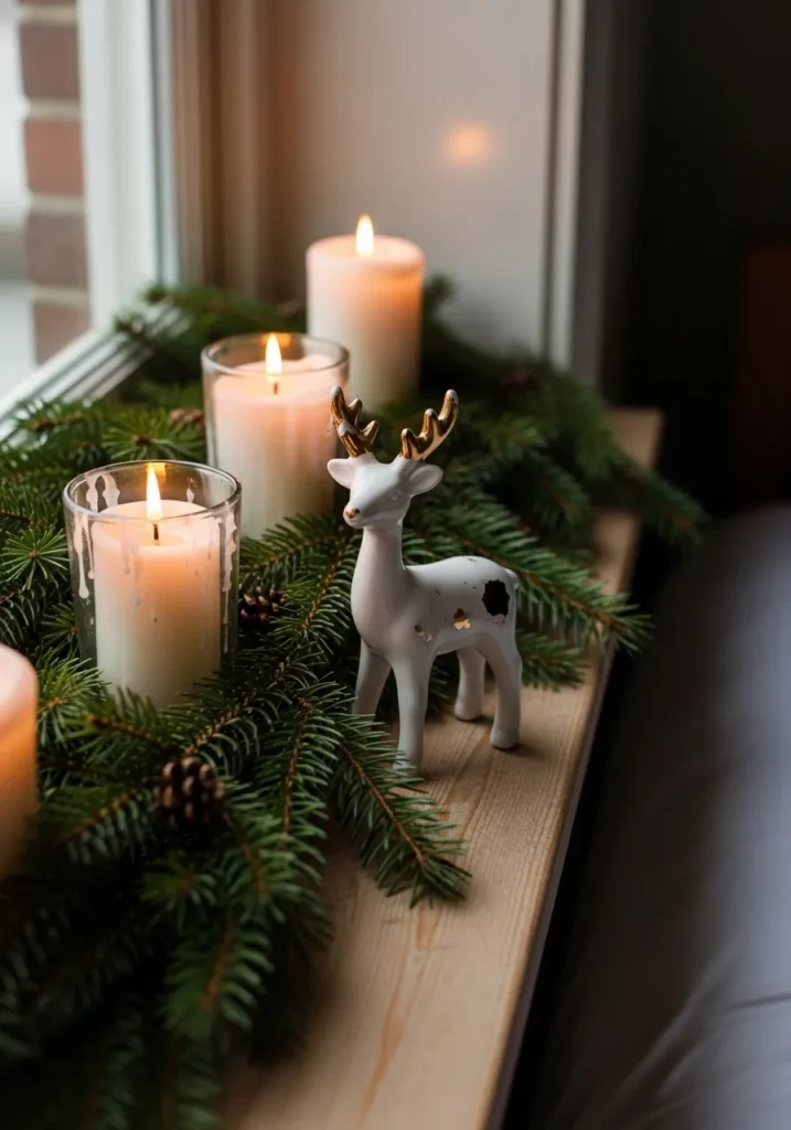 This cozy Christmas setup features a simple windowsill transformed into a glowing little holiday nook. Fresh pine branches with tiny cones lay across the wooden surface, creating that perfect touch of nature. Tall white candles flicker softly in glass holders, and right in the middle stands a delicate white reindeer with golden antlers. The mix of greenery, candlelight, and a tiny bit of shine feels both festive and effortlessly elegant—like something straight out of a Nordic Christmas fairytale.