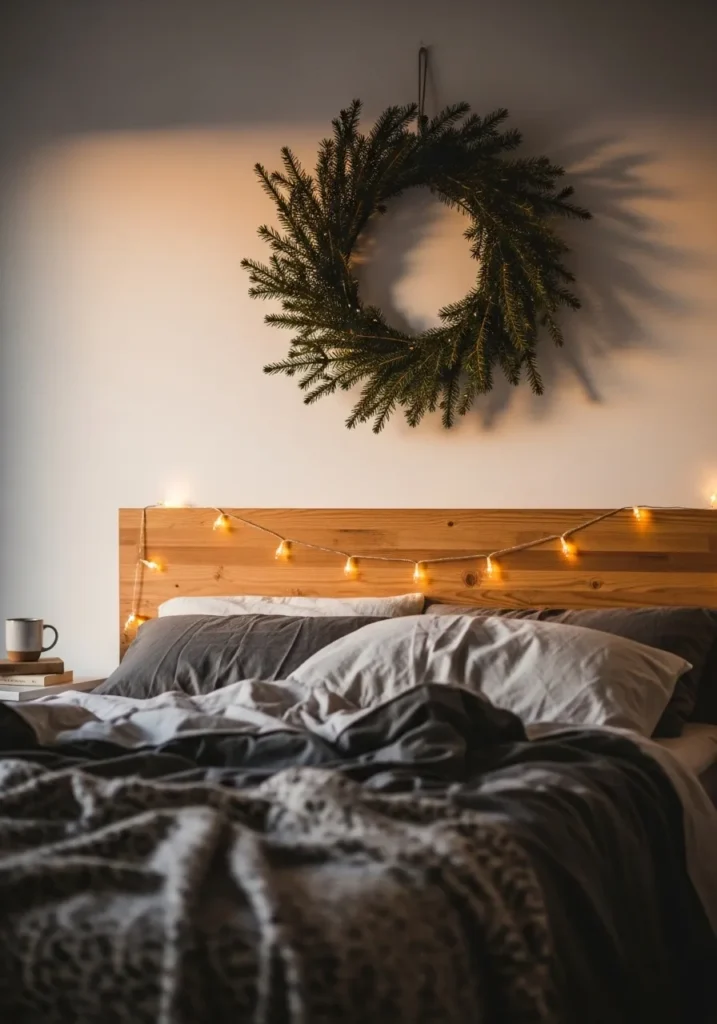 This cozy bedroom captures that perfect balance between simplicity and holiday charm. A single evergreen wreath hangs gracefully above a wooden headboard, paired with a gentle string of golden fairy lights that softly glow against the warm wood tones. The bedding layers in shades of gray and cream create a relaxed, lived-in comfort that feels inviting without trying too hard. It’s understated, natural, and perfectly peaceful—the kind of space that makes you want to slow down and savor quiet winter mornings.