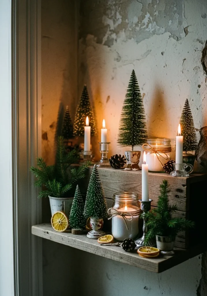 This cozy little corner captures that perfect mix of rustic charm and Christmas warmth without spending a fortune. Simple wooden shelves hold a collection of tiny evergreen trees, mason jar candles, and a few dried orange slices for a natural pop of color. The soft flicker of candlelight reflects gently on the worn wall behind, giving the whole setup a nostalgic, old-world glow. A couple of pinecones tucked in here and there complete the look, making it feel effortlessly magical.