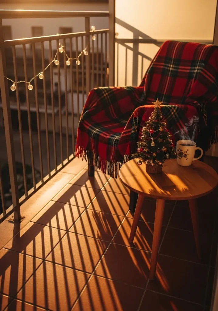 This little balcony setup captures that perfect mix of simplicity and warmth that makes small-space decorating feel magical. A red plaid blanket draped over a cozy chair sets the scene, while a tiny Christmas tree on a wooden side table brings just the right amount of festive charm. The soft string lights hanging along the railing cast a gentle glow as the golden hour light spills across the tiles, creating that dreamy late-afternoon coziness that feels like a hug.