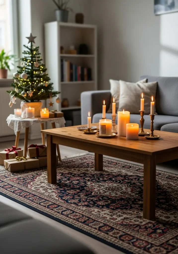 This cozy living room proves that simplicity and warmth can outshine even the most extravagant holiday setups. A petite Christmas tree trimmed with twinkling fairy lights and handmade ornaments sits proudly beside a soft gray sofa, while the wooden coffee table steals the show with its beautiful cluster of candles in mixed heights and holders. The soft glow reflects off the brass accents and patterned rug, filling the space with that magical golden-hour feeling we all crave on chilly December nights.