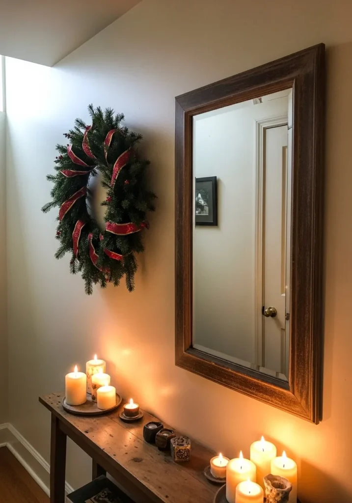 This simple entryway feels instantly festive with just a few thoughtful touches. A rustic wooden console holds an assortment of pillar candles in varying heights, their soft glow reflecting beautifully in a wood-framed mirror above. On the wall, a classic evergreen wreath wrapped with a deep red ribbon adds that perfect hint of Christmas spirit without overwhelming the space. The natural textures, warm lighting, and minimal decor make the whole setup feel cozy and inviting—like the calm before the Christmas chaos begins.