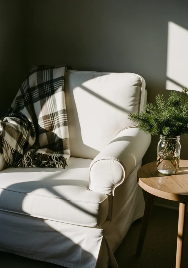 This cozy farmhouse corner feels like the perfect spot to unwind on a chilly winter morning. The soft cream armchair gives off a welcoming, lived-in vibe, made even warmer by the brown plaid throw draped casually over the arm. A simple wooden side table holds a mason jar filled with fresh pine clippings, adding a touch of nature that feels so effortlessly festive. The sunlight streaming through the window highlights every soft texture and shadow, making the whole scene glow with understated comfort.