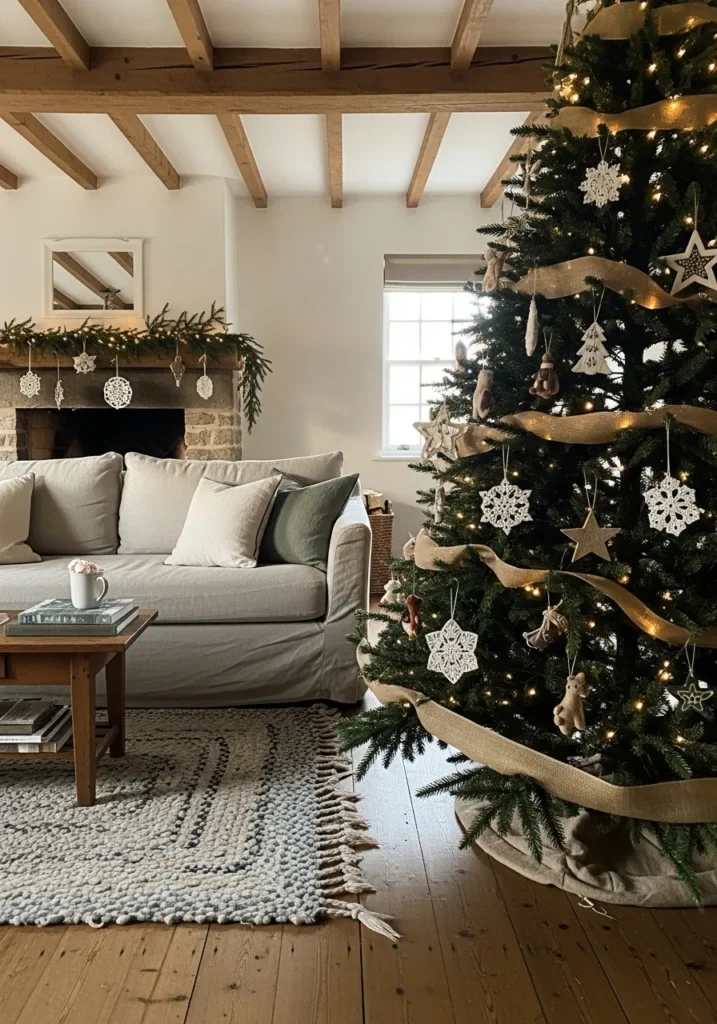 This living room feels like the definition of farmhouse comfort during Christmas. The natural wood beams, stone fireplace, and soft neutral sofa create a warm, grounded atmosphere that feels so effortlessly lived in. The Christmas tree is dressed with handmade-looking ornaments, twine ribbons, and soft golden lights that add a gentle sparkle without overpowering the space. Every element, from the chunky knit rug to the simple mug of cocoa on the coffee table, works together to create a sense of peaceful simplicity.