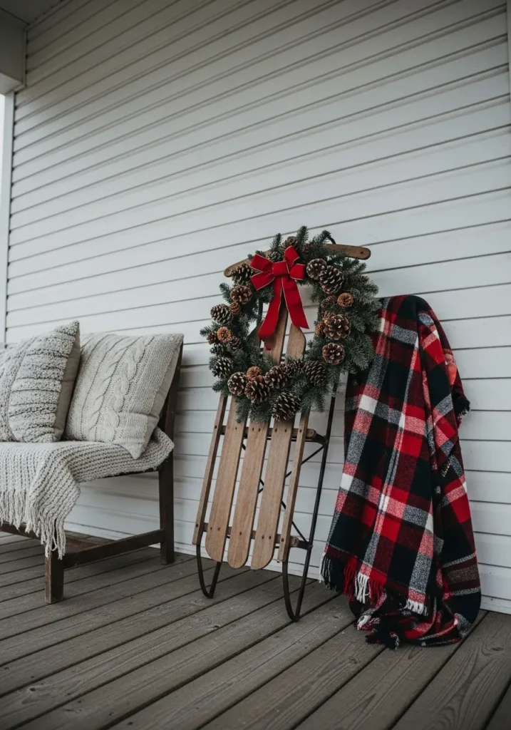 I absolutely love how this setup blends nostalgia with comfort. The sled instantly reminds me of childhood winters, while the plaid blanket adds just the right touch of cozy cabin energy. It’s simple but feels incredibly thoughtful, like a little hug waiting at the front door. I’d sit here with a cup of cocoa in hand and just watch the snow fall—it’s that kind of scene that makes Christmas feel both timeless and personal.