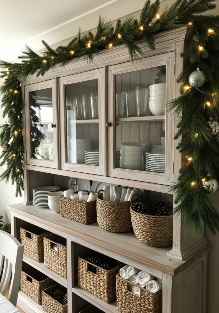 This farmhouse hutch is the definition of practical beauty. The whitewashed wood adds that perfect touch of rustic charm, while the woven baskets bring warmth and texture to the space. Stacked white dishes, neatly folded linens, and glassware behind the cabinet doors make everything feel organized yet inviting. The garland of pine greenery draped across the top, sprinkled with twinkling fairy lights and silver ornaments, ties it all together with a subtle Christmas sparkle that feels both natural and festive.