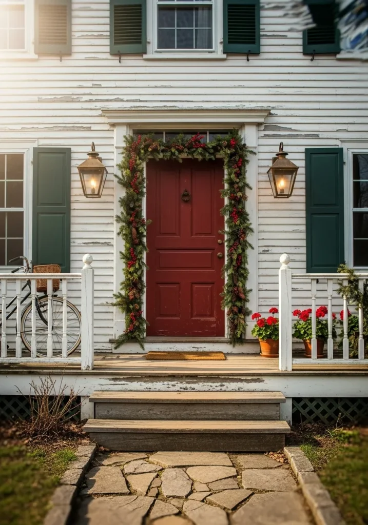 This beautiful farmhouse entrance captures everything we adore about traditional Christmas style. The weathered white siding and green shutters instantly feel nostalgic, while the deep red front door becomes the warm, festive centerpiece. Pine garlands trimmed with berries and pinecones frame the doorway, giving it that cozy, storybook feel. The stone walkway and simple porch, complete with a vintage bicycle and pots of bright red flowers, add a touch of everyday charm that feels both timeless and inviting.