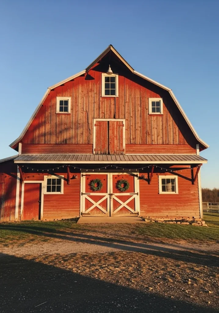 I absolutely adore how effortlessly charming this design feels. It’s simple, cozy, and nostalgic in all the right ways. There’s something so heartwarming about a traditional red barn dressed for Christmas—it just feels like home, even if you’ve never lived on a farm. The natural textures, the wreaths, and that warm evening sunlight create a sense of peace that’s hard to beat. It’s the kind of place that makes you want to pour a mug of cocoa, grab a knit blanket, and just soak in the moment.