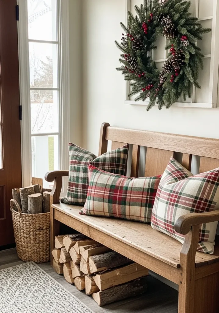 This charming entryway captures the essence of farmhouse Christmas comfort with its simple yet heartwarming touches. A natural wood bench anchors the space, perfectly paired with plaid pillows in shades of red, green, and cream that instantly whisper holiday cheer. A lush evergreen wreath decorated with pinecones and red berries adds that classic Christmas charm, while the woven basket filled with firewood hints at cozy nights by the fire. The sunlight streaming through the window softens everything, making the whole corner feel like a warm welcome home.