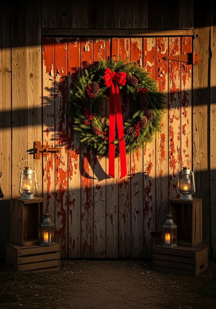 I absolutely love how this setup feels so effortlessly inviting. There’s something magical about the contrast between the peeling paint and the fresh, vibrant wreath—it’s like tradition meeting timeworn beauty. The lanterns flickering softly make it feel like home, even if it’s just a barn door. It reminds me that Christmas charm doesn’t need perfection, just a bit of love and light in the right places.