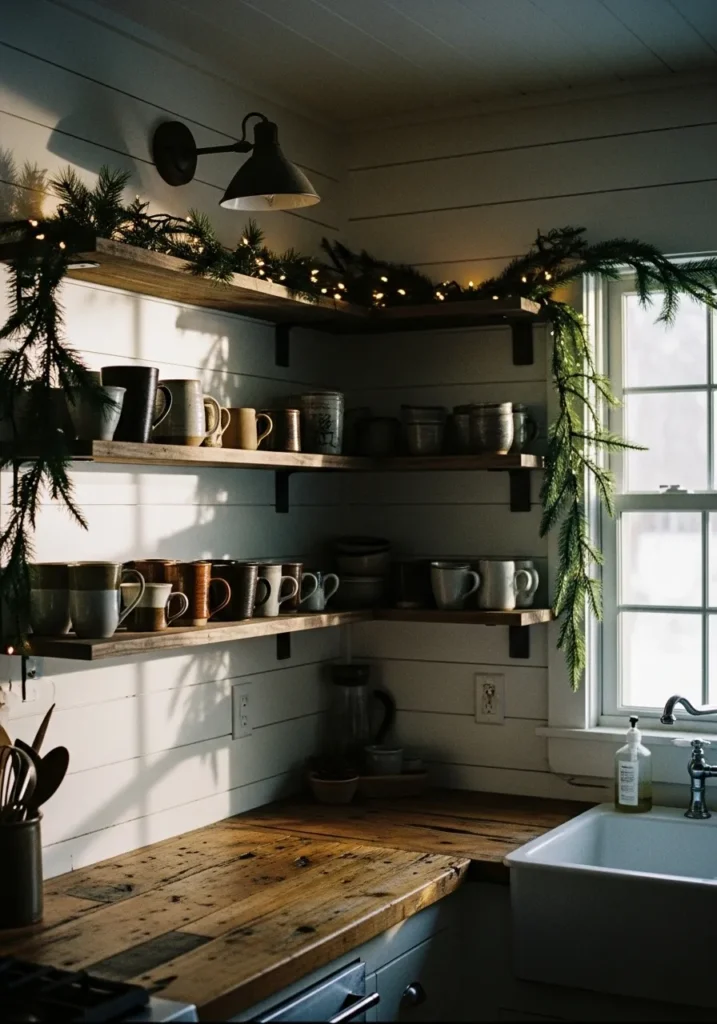 This little farmhouse kitchen corner feels like a warm hug on a winter morning. The open wooden shelves, lined with handmade mugs in soft earthy tones, create that perfect mix of practical and pretty. The natural wood countertop adds a timeworn texture that feels lived-in and loved, while the shiplap walls keep everything bright and fresh. I especially adore the way the evergreen garland and twinkle lights drape along the shelves, bringing just the right amount of Christmas cheer without overwhelming the space.