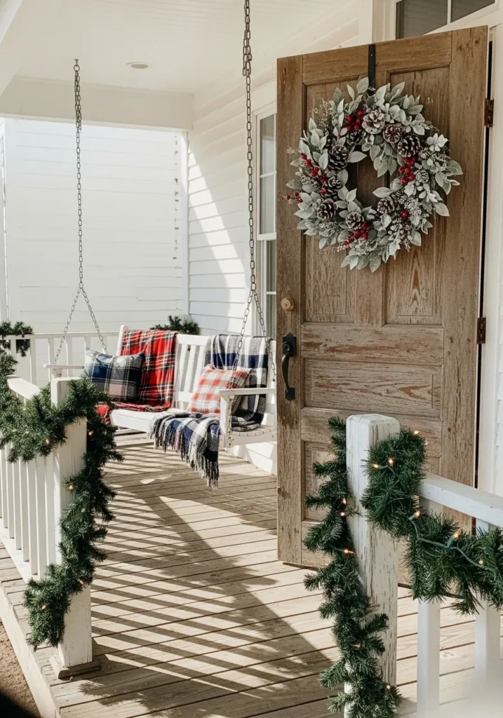 This charming farmhouse porch feels like something straight out of a Christmas movie. A rustic wooden door welcomes you with a frosted pine and berry wreath, while the white swing draped in plaid blankets invites you to sit back and sip cocoa. Garland wrapped around the railing twinkles softly, and the mix of textures—from the weathered wood to the crisp white siding—adds that perfectly imperfect farmhouse warmth we all love.