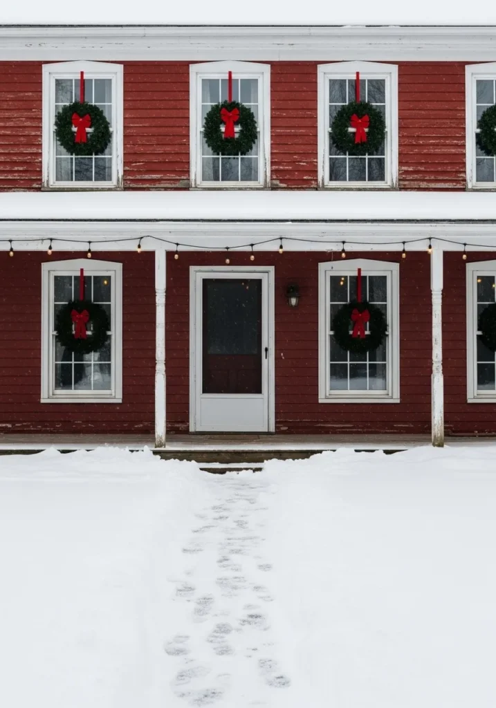 This timeless red farmhouse looks like it was plucked straight from a Christmas card. Its rustic wood siding wears just the right amount of weathering, giving it that authentic country charm we all secretly adore. Every window is framed with a lush green wreath tied neatly with a red ribbon, creating a beautiful contrast against the snow-covered ground and white trim. The simple string of warm lights along the porch adds a soft, golden glow that feels like a gentle welcome after a long snowy walk.