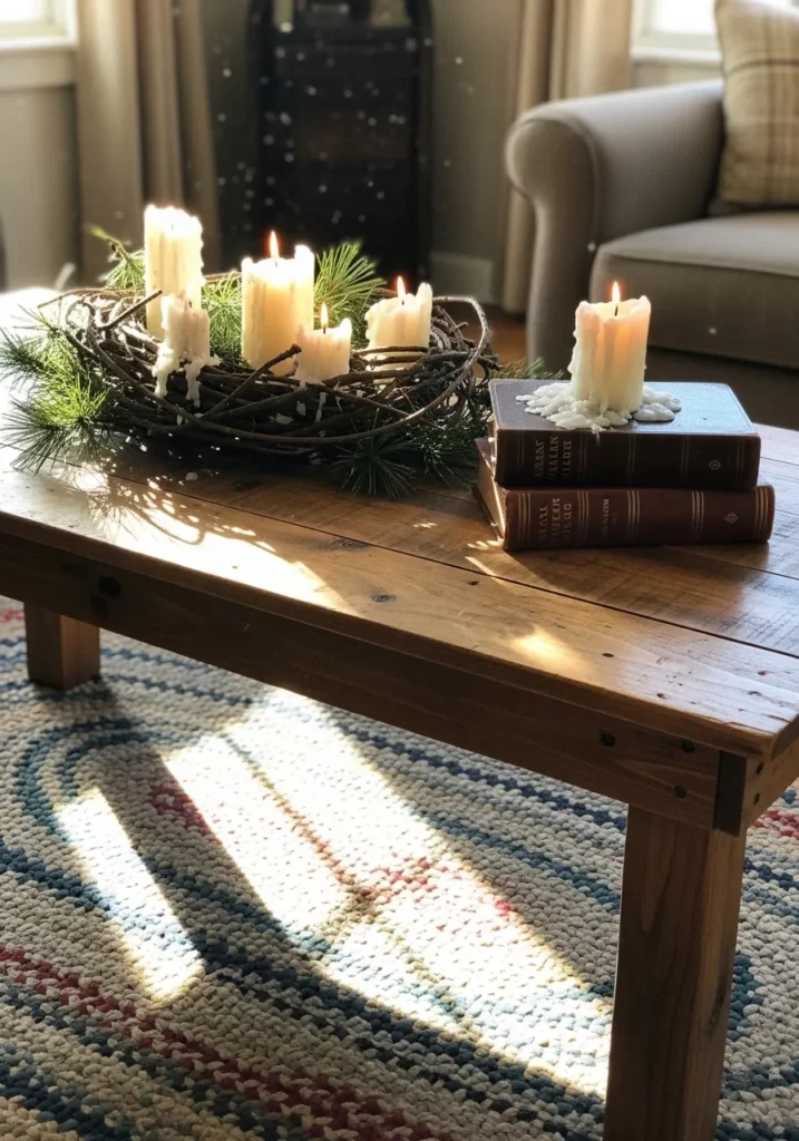 This cozy farmhouse living room setup feels like a warm hug on a chilly December morning. The sturdy wooden coffee table, complete with visible grain and tiny imperfections, instantly brings that down-to-earth country feel. A simple centerpiece of melted pillar candles resting inside a twig wreath with pine sprigs adds a natural, handmade charm that feels perfectly imperfect. The soft morning sunlight glows through the windows, bouncing off the braided rug with its cheerful mix of blues and reds, creating a timeless Christmas moment that feels effortlessly real.