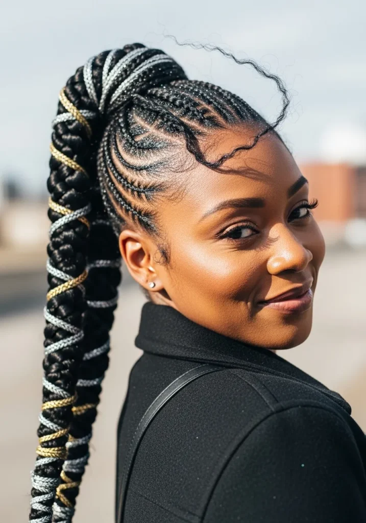 This look takes a high ponytail and turns it into pure statement energy. The braids are sleek and defined, pulled up into a tall pony that’s wrapped in silver and gold threads for that modern glam twist. The clean lines of the braids meet the shimmer of the metallic wraps, creating a look that’s bold, creative, and full of personality.