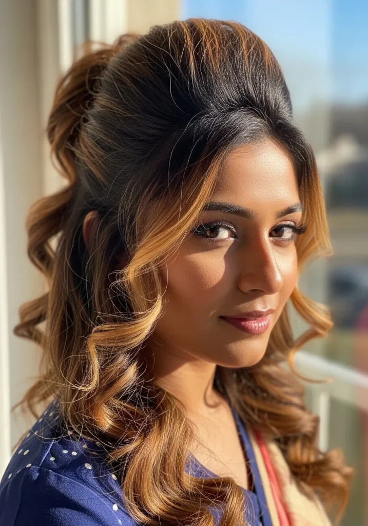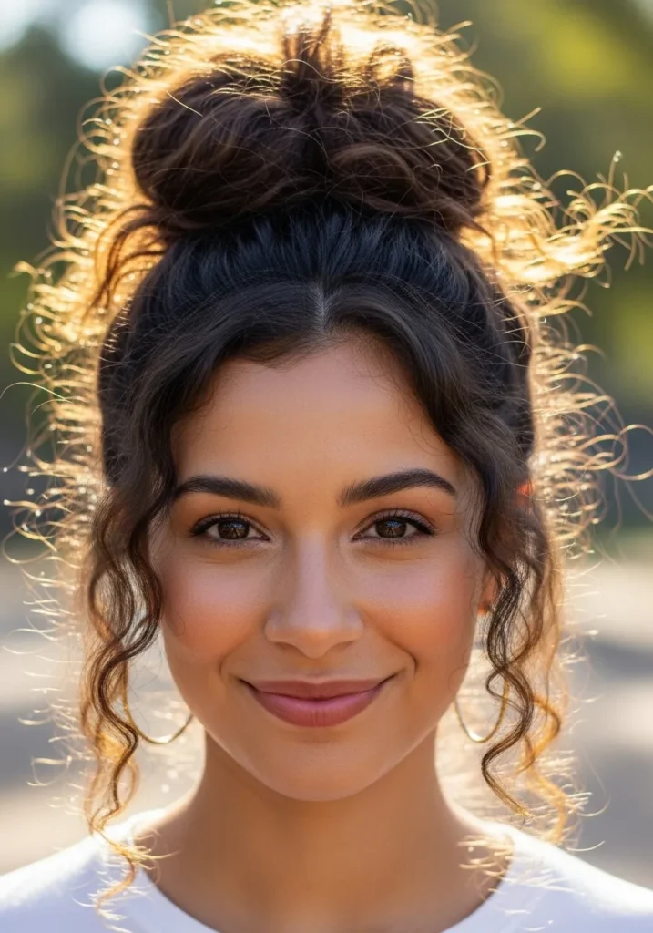 This hairstyle is all about casual glam. The curls are gathered high into a voluminous top bun with a few loose tendrils framing the face. The texture feels light and bouncy, and the soft lighting adds to its effortless charm. It’s fun, fresh, and full of personality.