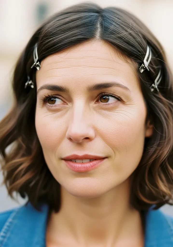 This chic short hairstyle features soft, natural waves paired with metallic clips on each side, giving it a trendy twist. The medium brown color with a subtle gloss makes it modern, while the clips add a playful touch. The result is a hairstyle that’s equal parts stylish and approachable.