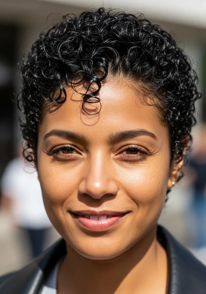 This hairstyle celebrates curls in their most natural form. The short pixie cut highlights tight, defined curls that add beautiful texture and volume. The shape frames the face softly while still keeping everything neat and balanced. It’s confident, fresh, and full of energy.