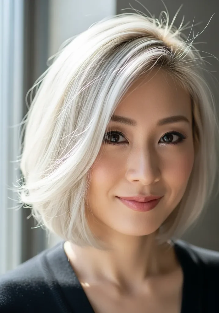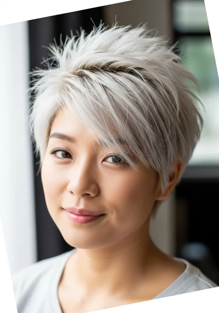 This bold pixie cut has short, choppy layers that create volume and texture, making the platinum color look even more striking. The tousled finish gives it a carefree vibe, while the icy tone feels crisp and fresh. It’s edgy yet playful, with a softness that balances out the boldness.