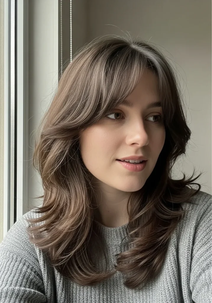 This hairstyle features a beautifully layered butterfly cut with long, feathery ends that flip out slightly, giving the hair movement and shape. The curtain bangs frame the face softly, blending effortlessly into the layers. The muted brown shade adds a natural touch that complements the volume and flow of the cut.