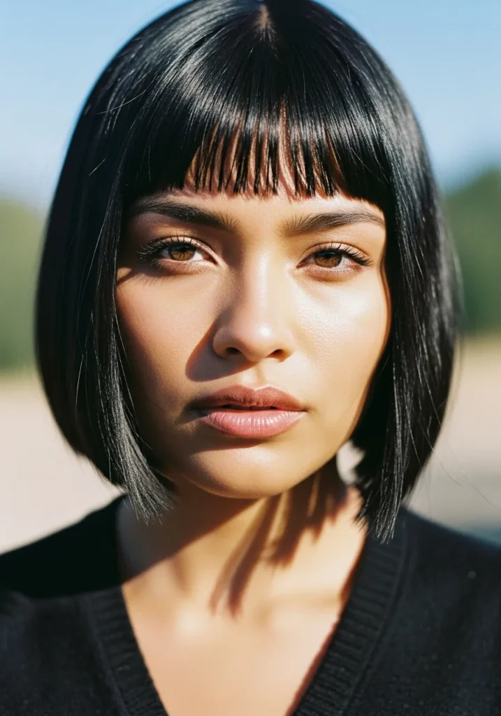 This look keeps things ultra-modern with a jet-black bob that hits perfectly at the jawline. The micro bangs add a daring twist, framing the face with a sharp, edgy contrast. The glossy texture reflects light like glass, making every strand look perfectly in place while still feeling chic and wearable.