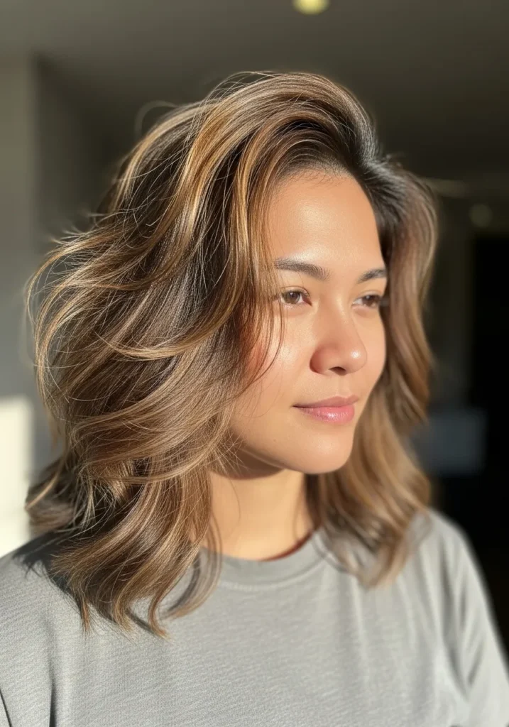 This hairstyle has gorgeous dimension, featuring soft layers that add volume and movement to a shoulder-length cut. The honey-toned highlights warm up the overall look, while the subtle waves make it feel light and effortless. The hair looks touchably soft, full of natural shine.