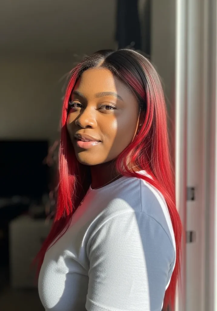 This look brings bold color to a sleek, straight style. The deep roots melt into a vivid red tone that glows under the light, creating an eye-catching contrast. The silky-smooth finish keeps it feeling refined and modern, while the middle part adds symmetry.