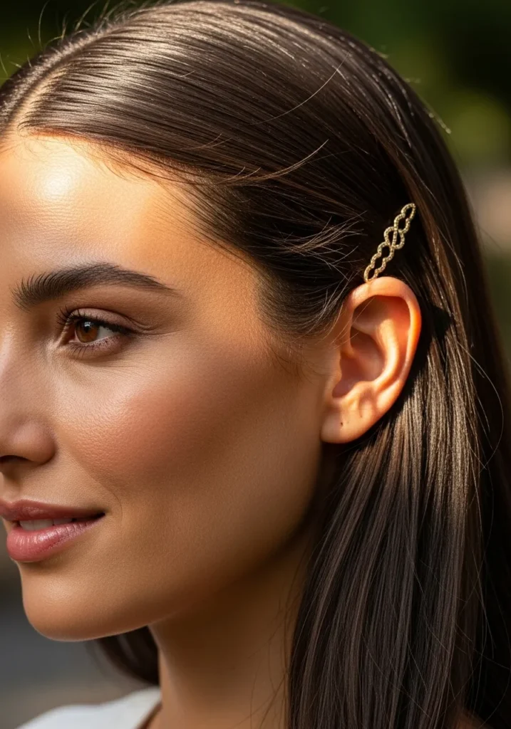 This hairstyle is simple but stunning. The sleek, straight hair is tucked neatly behind one ear, held in place with a delicate gold clip. The glossy finish gives it an elegant feel, while the asymmetry adds just the right amount of personality.