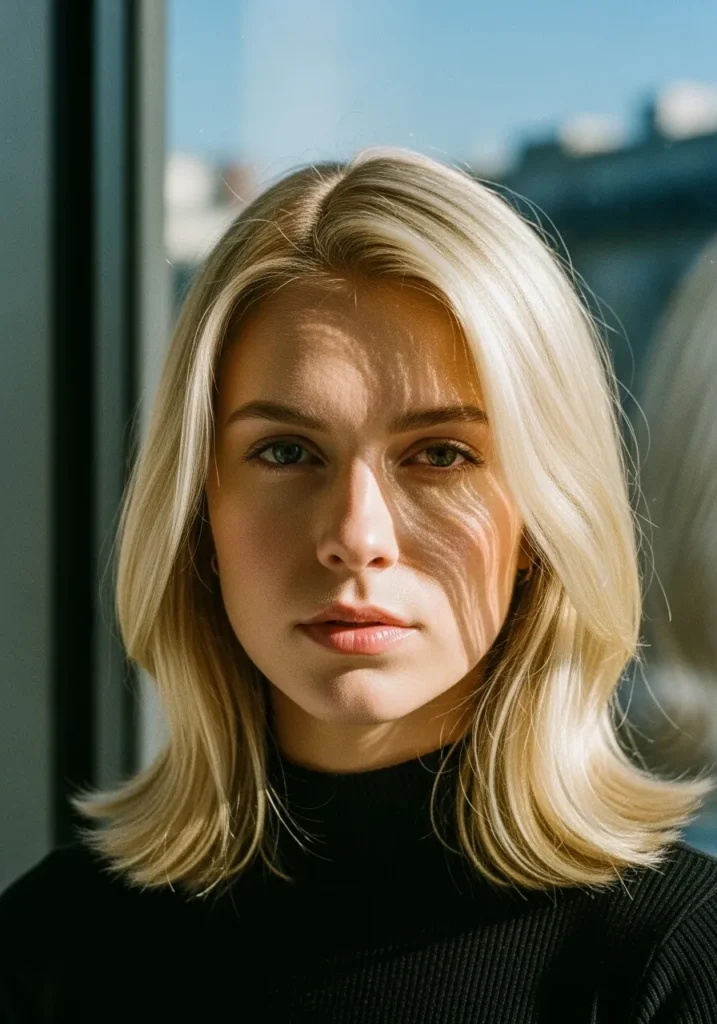 This medium-length hairstyle has soft, face-framing layers that create natural movement and shape. The sleek blonde strands fall just past the shoulders with a silky, light-reflecting finish that feels fresh and elegant. The subtle layering keeps it from looking too flat, adding just enough texture to feel modern.