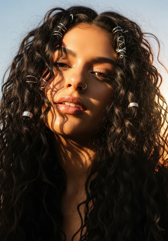This hairstyle is all about texture and attitude. The long, dark curls flow freely with a natural, voluminous bounce, and the silver hair rings scattered throughout add a bold, bohemian edge. Each curl catches the sunlight beautifully, giving the whole look that sun-kissed, effortless vibe that still feels intentional and striking.