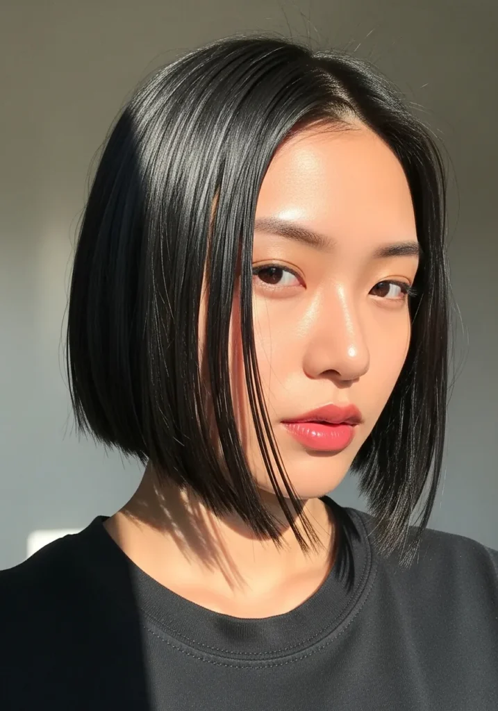 This hairstyle features a sleek, chin-length bob with perfectly straight strands that shine like polished glass. The jet-black color enhances its structure, giving it a sculpted and ultra-modern look. The middle part keeps everything clean and symmetrical, making it a striking yet timeless choice.