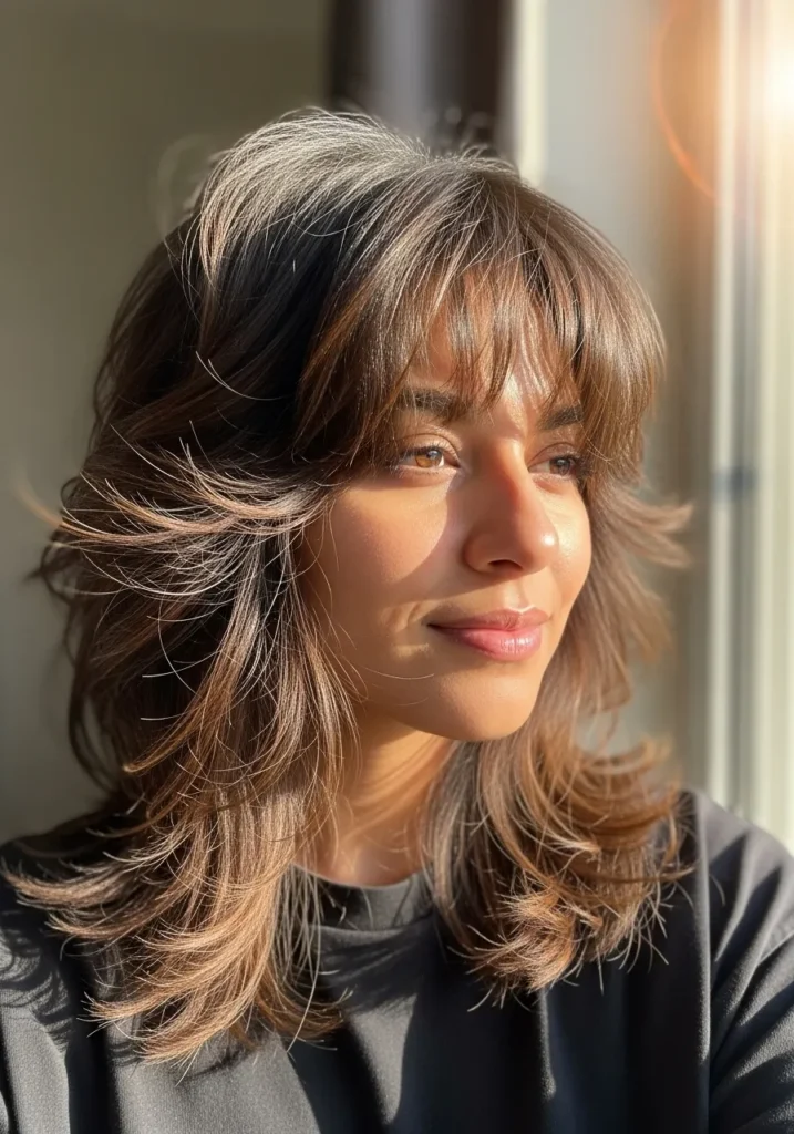 This cut is all about movement and texture. The layered shag frames the face beautifully with light, feathery ends that flick outward, and the wispy bangs soften the overall look. The mix of warm brown tones and soft sunlight enhances the dimension, giving it that effortless lived-in vibe.