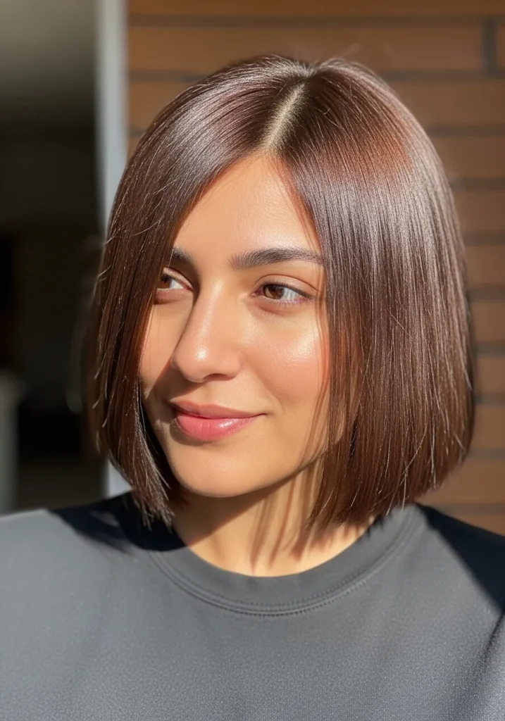 This straight, chin-length bob is sleek, shiny, and symmetrical with a sharp middle part that keeps it looking ultra-modern. The chestnut brown color adds warmth, and the mirror-like finish gives it an expensive, high-gloss feel. It’s a simple cut, but it’s done with precision and confidence.
