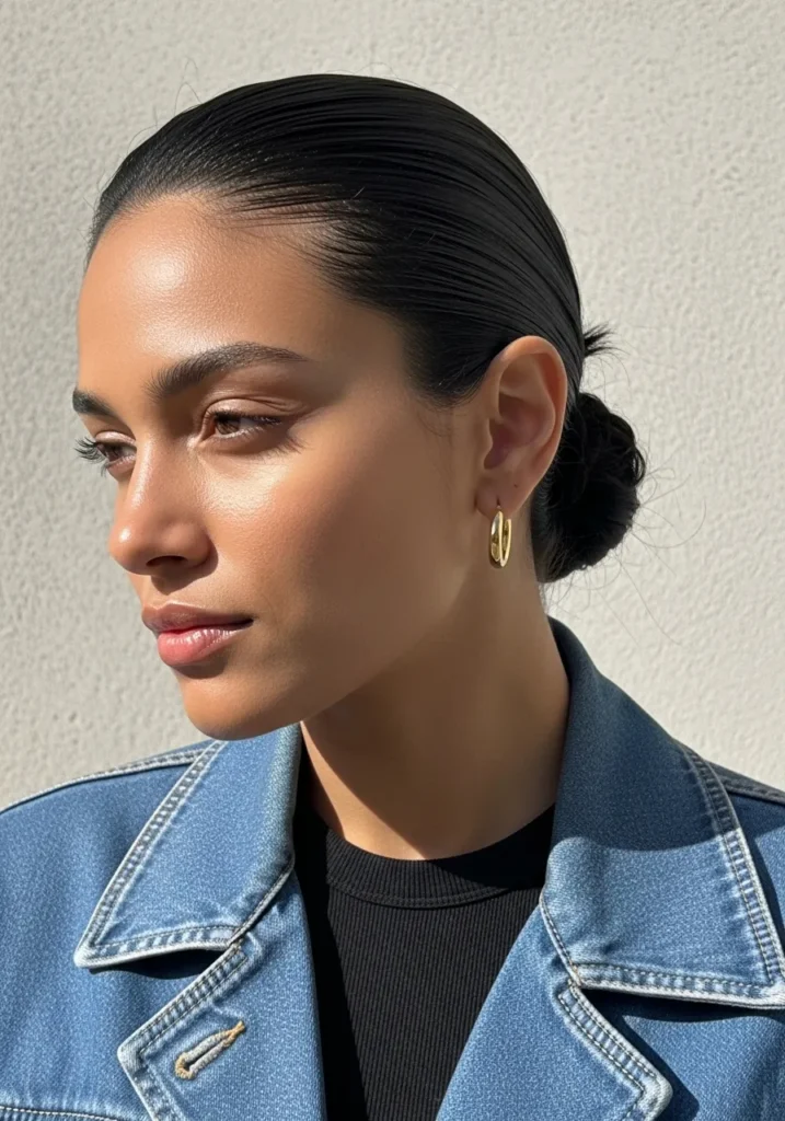 This look is all about minimal elegance. The hair is slicked back tightly into a low bun with a glossy, smooth finish that gleams in natural light. The clean lines and middle part give it that runway-ready sharpness while still feeling approachable.