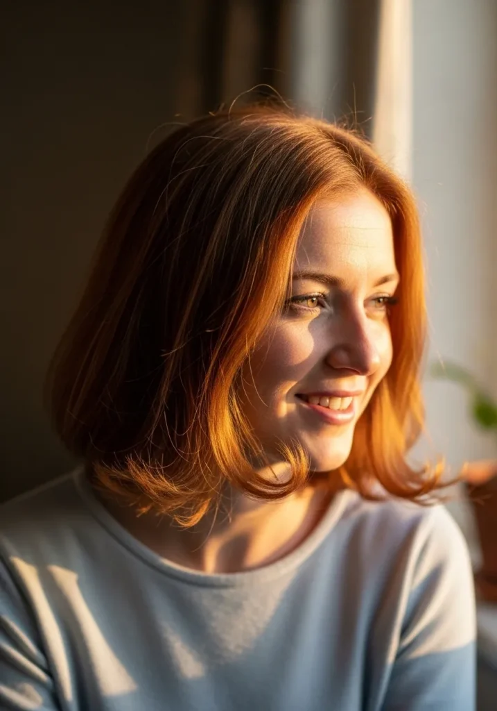 This hairstyle features a softly layered bob that brushes just above the shoulders, glowing with rich copper tones that catch the light beautifully. The smooth strands have a natural bounce, creating a look that feels effortless yet perfectly styled. The light reflecting off the hair gives it a soft radiance that feels warm and modern all at once.