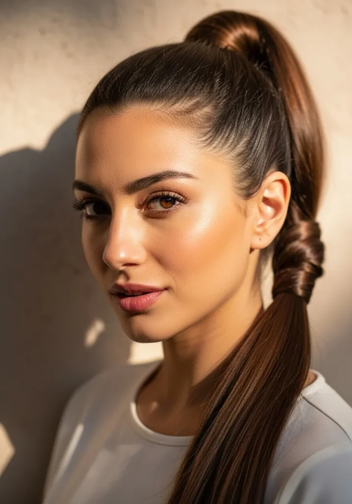This look is the definition of clean and confident. The hair is pulled into a perfectly sleek high ponytail, with a wrapped section of hair around the base for a polished finish. The smooth strands cascade down in a glossy flow that catches the light beautifully, creating a look that feels sharp yet feminine.