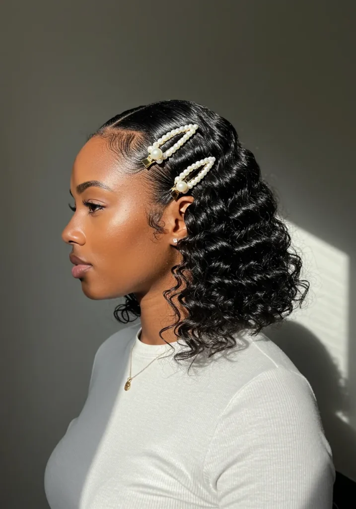 This mid-length curly hairstyle is styled with a side part and adorned with two pearl clips. The curls are tight, glossy, and full of bounce, giving the whole look energy and dimension. The accessories add a sophisticated, festive shine.