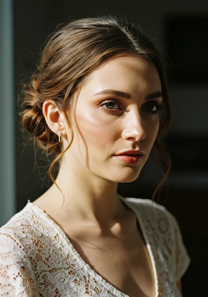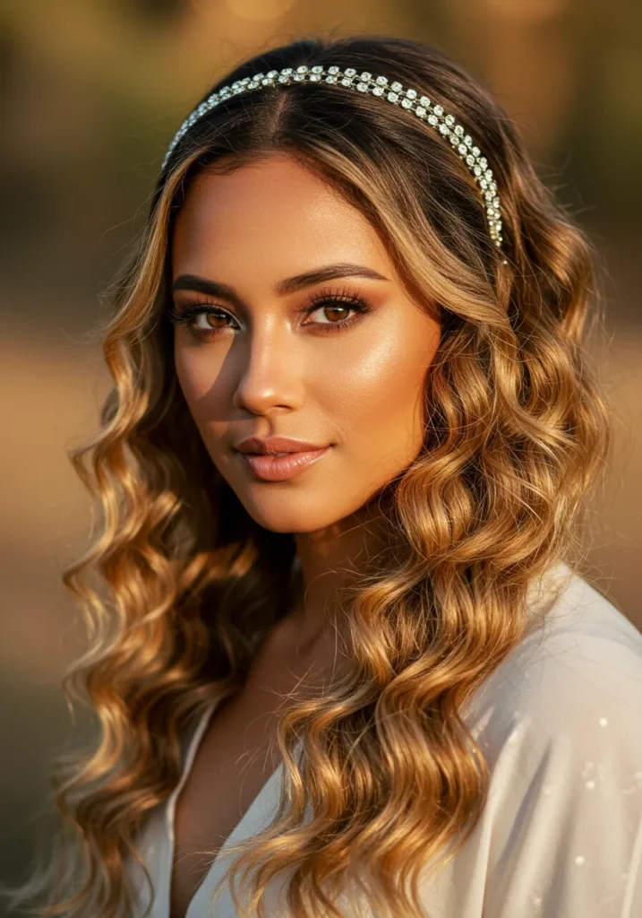 A low bun styled with soft, face-framing strands and a crystal headband gives this look a dreamy, regal charm. The hair is sleek but not overly structured, keeping it soft and flattering under warm light.