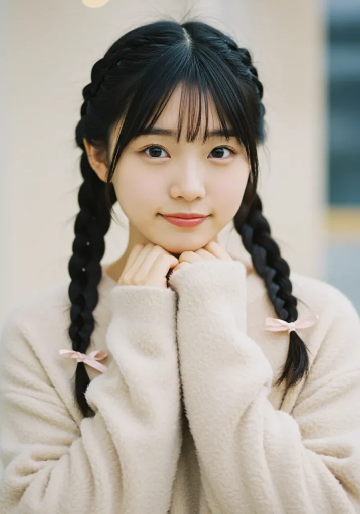 Two neat braids fall evenly on each side, tied off with light pink ribbons that add a soft and playful charm. The smooth braiding and wispy bangs frame the face gently, making it look youthful and full of sweetness.