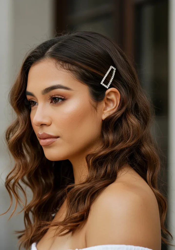 This shoulder-length hairstyle features loose, effortless waves that add bounce and movement. The soft brown tones catch the light beautifully, while a simple rectangular pearl clip brings a touch of festive shine. The texture feels natural and slightly tousled, giving it that relaxed yet elegant finish.