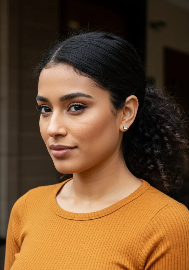 This low ponytail combines smooth roots with naturally curly ends for a style that’s both sleek and full of volume. The hair is pulled back neatly, creating a balanced contrast between structure and movement.