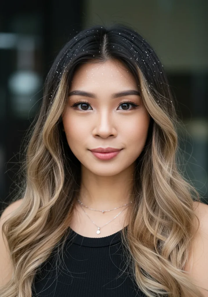 Long, softly curled waves flow naturally down the shoulders, with a sprinkle of fine glitter giving the hair a subtle, magical shimmer. The warm blonde ombré tones blend seamlessly, creating a dreamy glow under the lights.