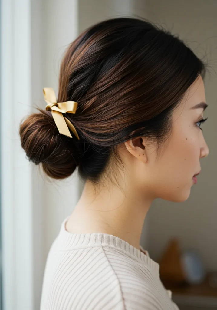 This smooth low bun is styled neatly at the nape, tied with a small gold ribbon that adds a festive and feminine touch. The soft brown tones of the hair catch the light beautifully, while the clean finish keeps it timeless and elegant.