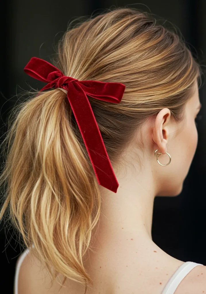 This soft, mid-length ponytail sits low at the nape, tied with a plush red velvet ribbon that adds instant festive charm. The subtle blonde waves and loose strands make it feel easy and romantic. It’s polished yet still playful — a true party classic.