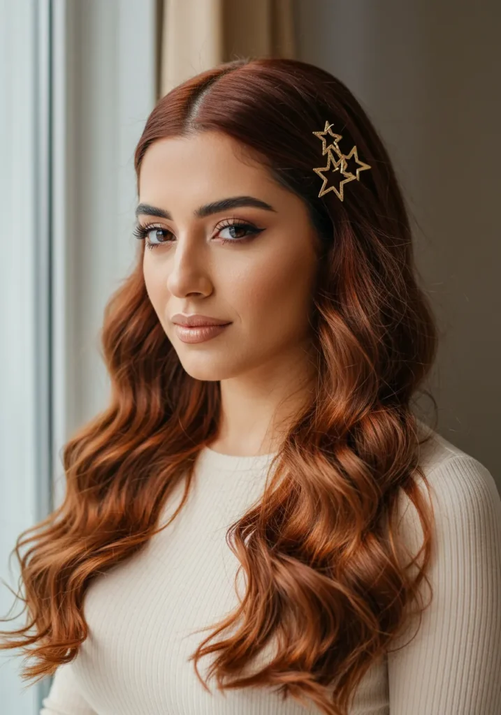 Long, flowing red hair styled into big, defined waves gives major old-Hollywood energy. The golden star clips on one side bring that hint of holiday sparkle that feels magical without being over the top. The shine and color depth make it impossible not to notice.
