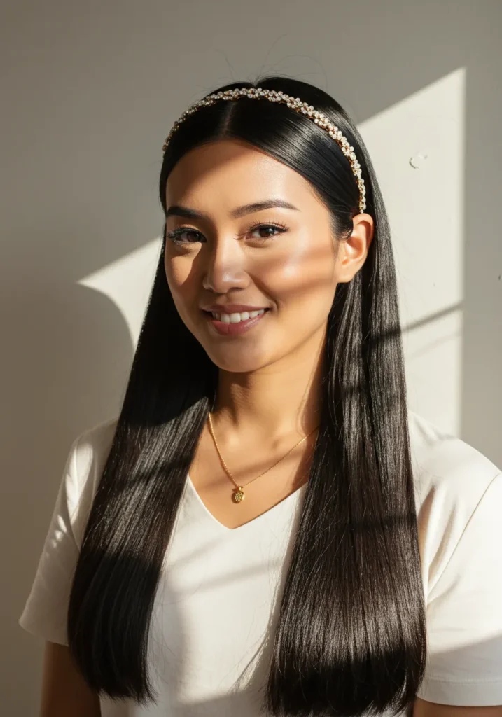 This long, straight hairstyle has a glossy mirror-like finish that catches the light beautifully. The hair is parted neatly down the middle, flowing smoothly past the shoulders with not a wave in sight. A delicate pearl headband adds just the right amount of sparkle, creating a polished and graceful party look.